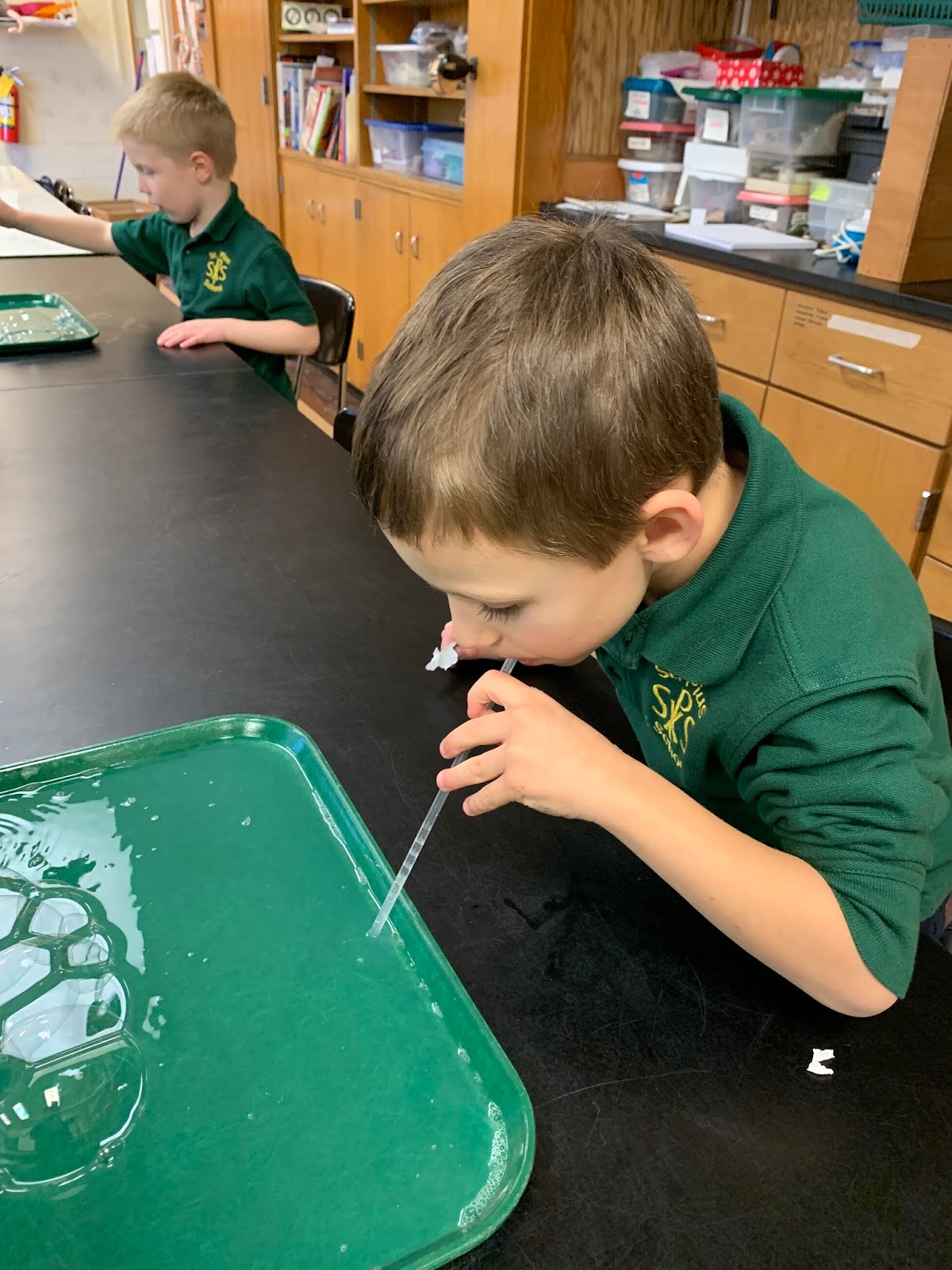 Then we used a straw and a tray with a little water and dish soap to blow bubbles.